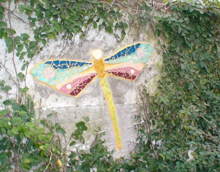 Libélula realizada sobre malla para colocar en el exterior. Se utillizó: venecitas vítreas comunes e iridiscentes, gemas vítreas y azulejos.